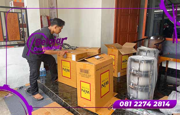 Belajar Drumband sudah terbiasa mengirim perlengkapan ke luar pulau. Tim mengatur proses pengemasan dengan hati-hati, menggunakan karton tebal, busa pelindung, dan peti kayu.