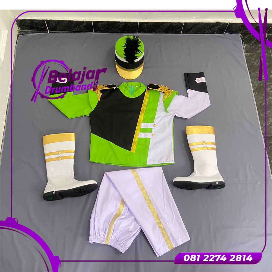 Atasan drumband berwarna hijau dengan hiasan khas